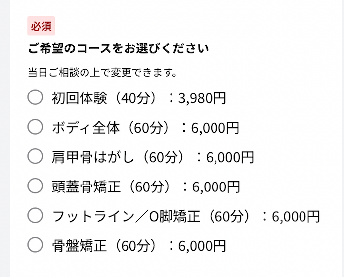 お一人で運営される場合や、スペース等が限られており同時間帯に1件しか予約を受け付けられない場合は、予約メニューを1つのみにし、コースの選択などは質問フォームを使用いただく方法をおすすめしております。