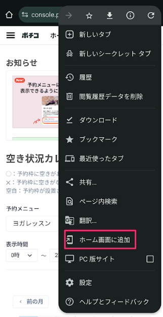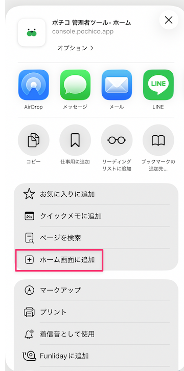 - 表示されたメニューから「ホーム画面に追加」を選択する