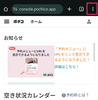 - Chromeなどのブラウザでポチコの管理者ツールを開き、右上の「⋮」ボタンをタップする