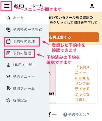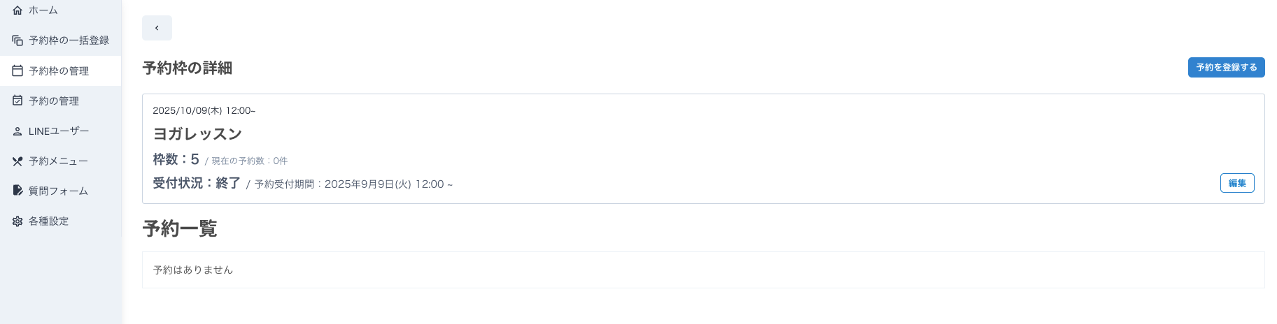左側のメニューから、「予約枠の管理」と「予約の管理」を選ぶことができます。