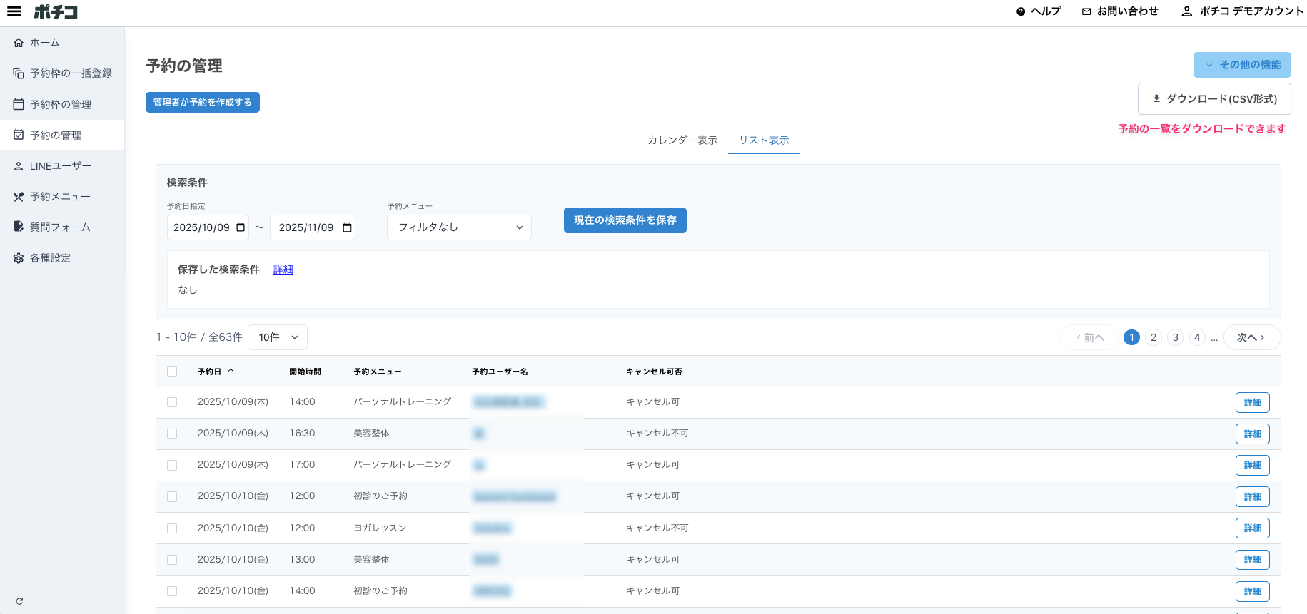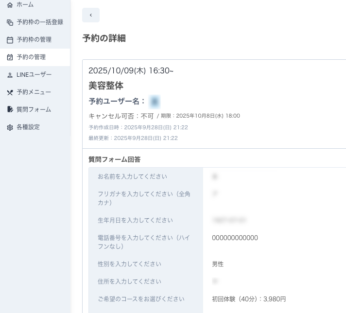 「詳細」ボタンを開くと、各予約ごとの質問フォームの回答などを確認できます。