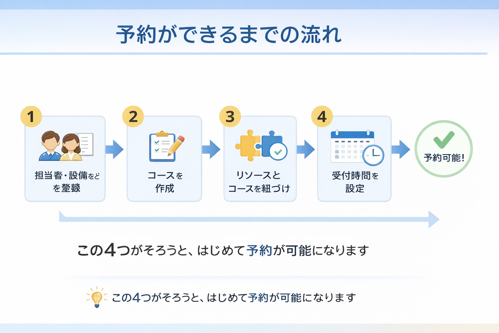 ステップ1:担当者(施設/物品)を登録する ステップ2:コースの登録をする ステップ3:コース対応表を設定する ステップ4:受付時間を設定する