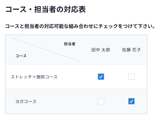 作成したコースと担当者(設備/物品)が表示されるので、紐づけたいもの同士にチェックを入れる。