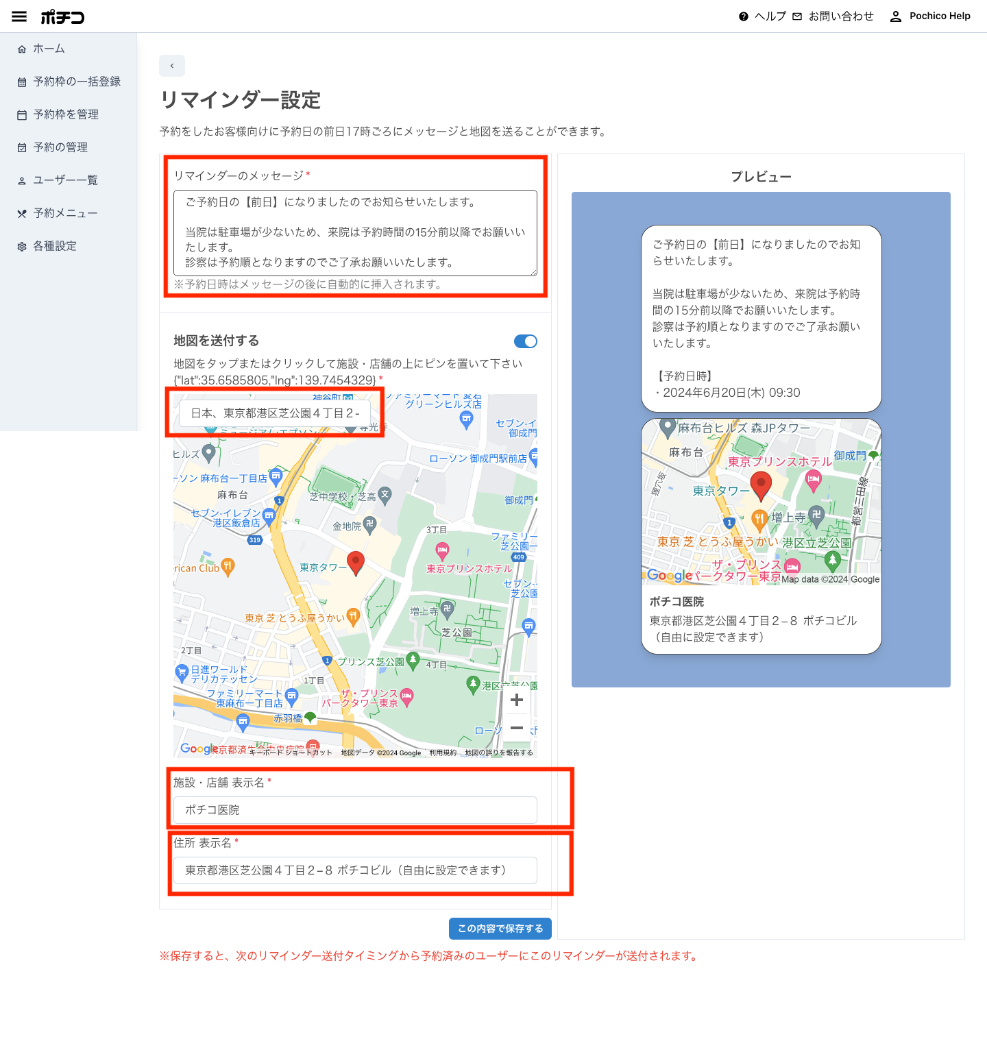 - 「リマインダーのメッセージ」と「地図の添付」有無を入力する。