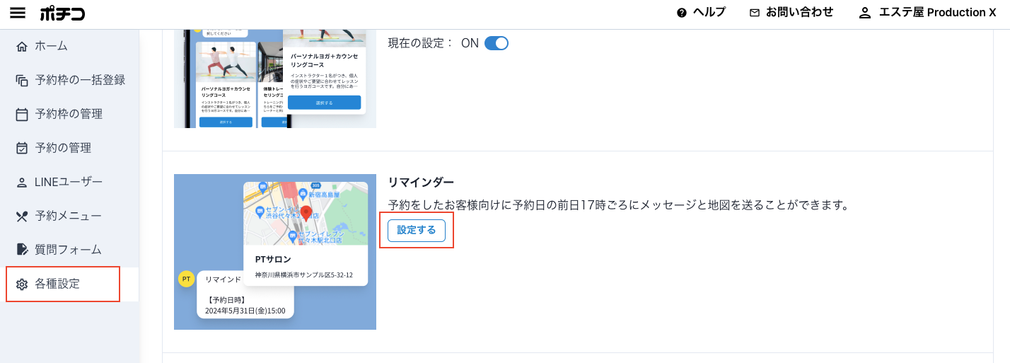 - 管理者ツール左側の「各種設定」をクリック → リマインダーの「設定する」を開く。