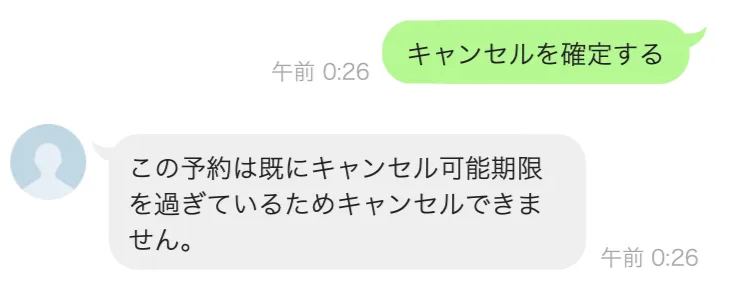 キャンセル期限を過ぎてから予約者がキャンセルの手続きをした場合は下記メッセージが送信されます。