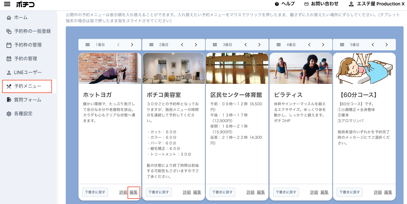 管理者ツール『予約メニュー』から対象メニューの「編集」を選択