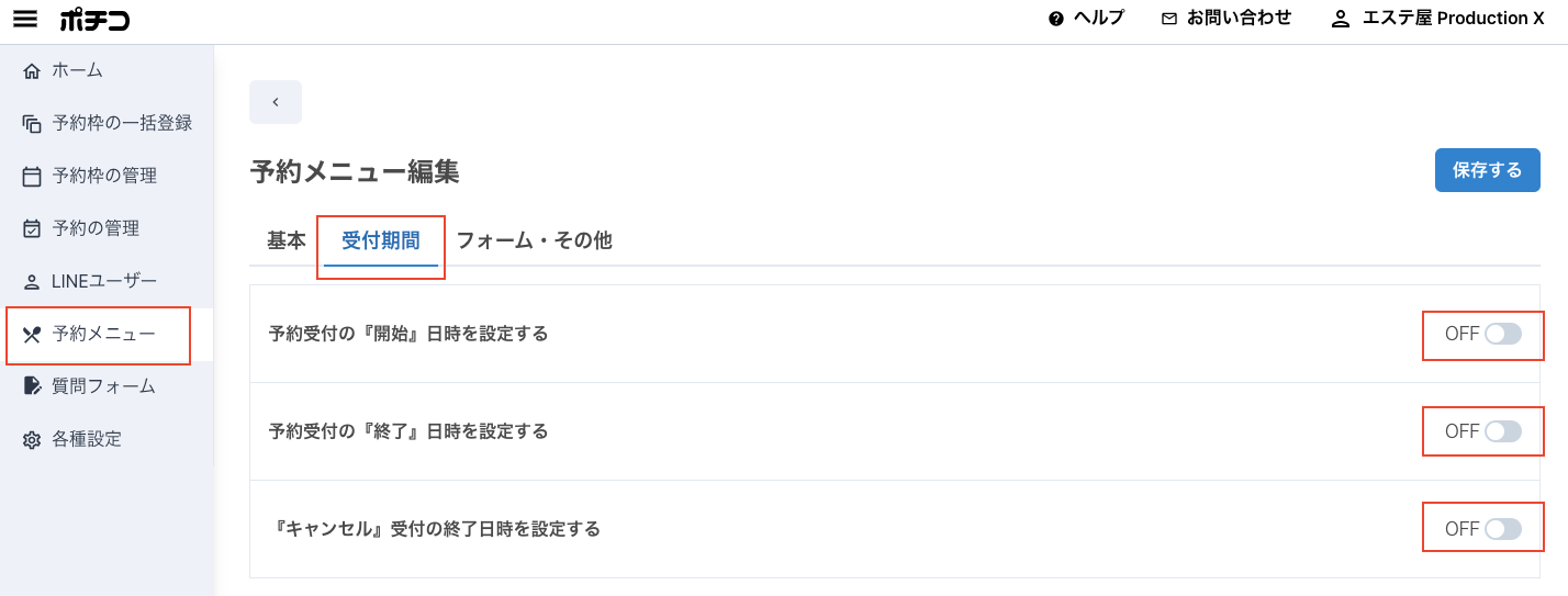 予約メニューごとに、「予約を開始する日時」「予約受付を終了する日時」「キャンセル期限」を設定することが出来ます。