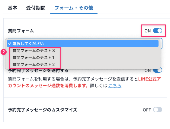 - 「質問フォーム」の横にあるボタンを「ON」にし、紐づける質問フォームを選択する。