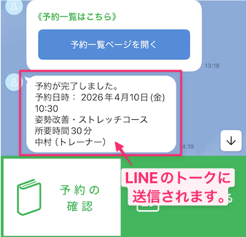 予約が完了した画面に表示する「予約完了メッセージ」を、LINEのトーク画面に送信することができます。