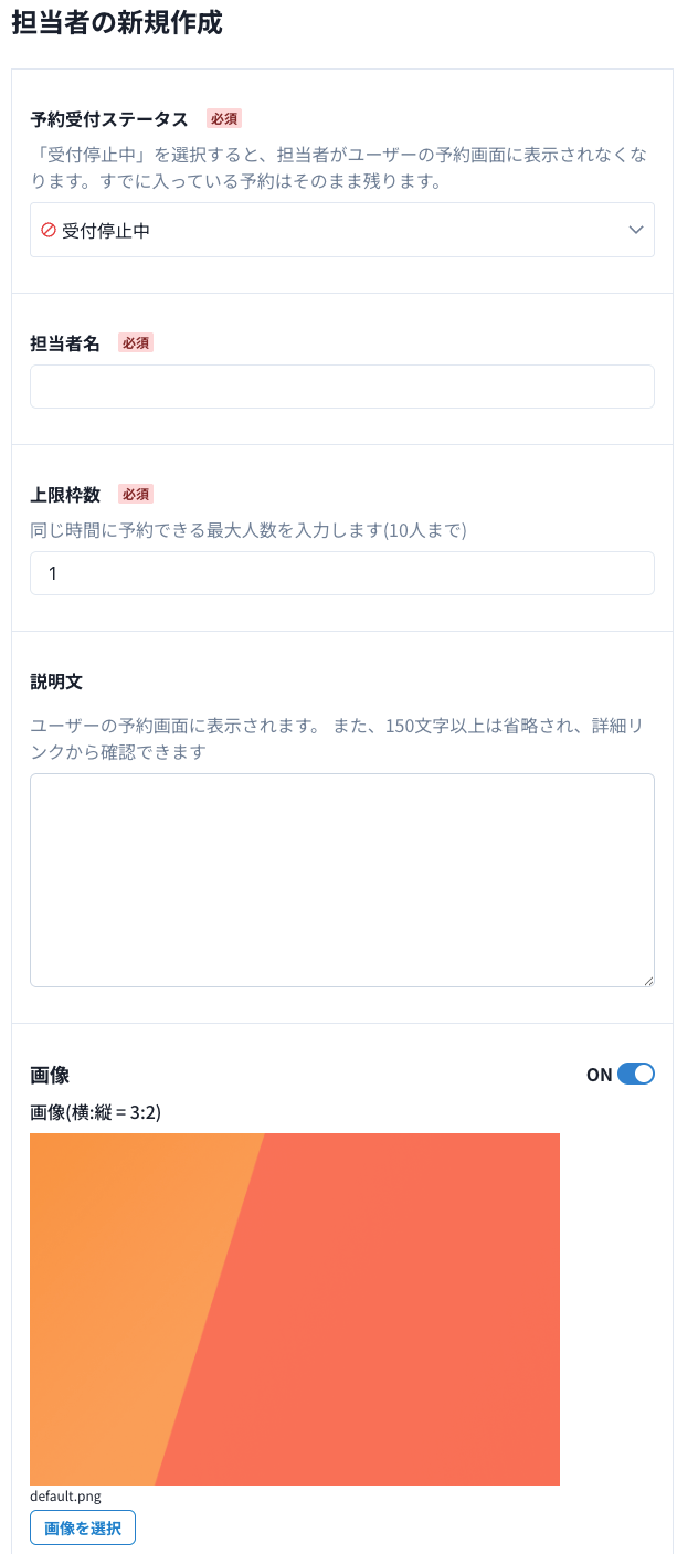 登録したい担当者(施設/物品)の名前を登録します。予約者にそのまま表示されます。