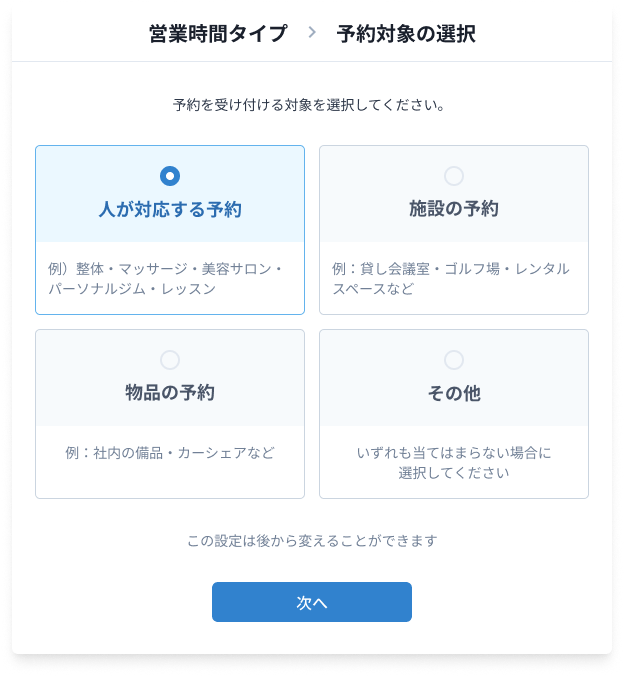 最初に選んだ予約対象によって、予約対象である「担当者(施設/物品)」の名称が変わります。あとから自由に変更できます。