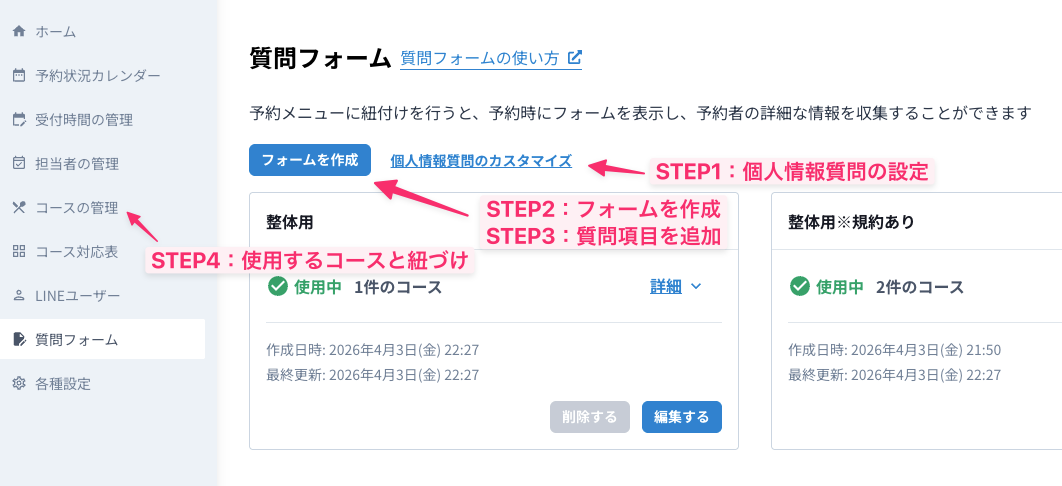 - 予約者に聞きたい項目(氏名・電話番号など)を設定しておくことができます。