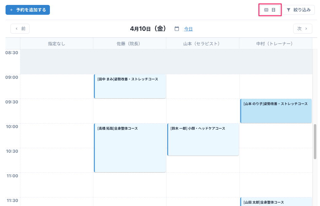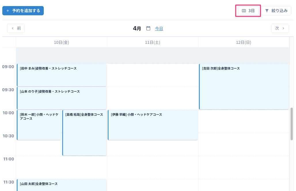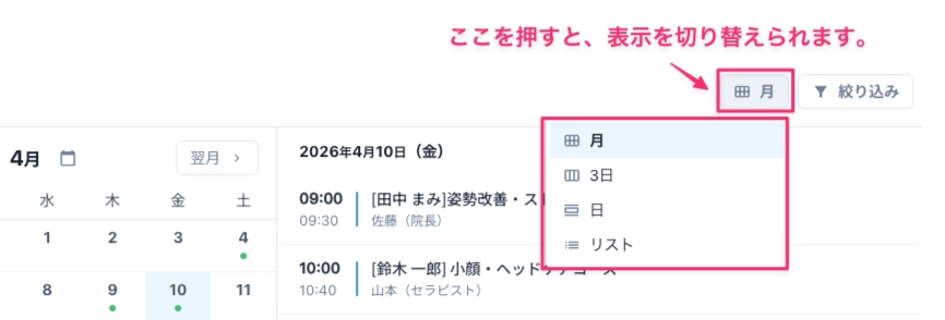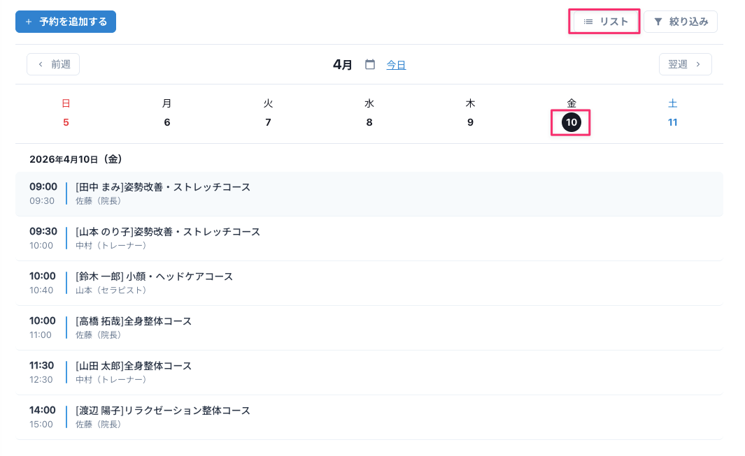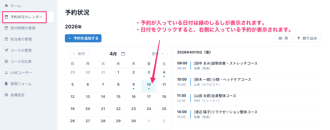 予約が入っている日付をクリックすると、右側に一覧が表示されます。