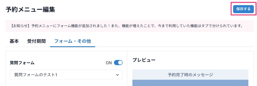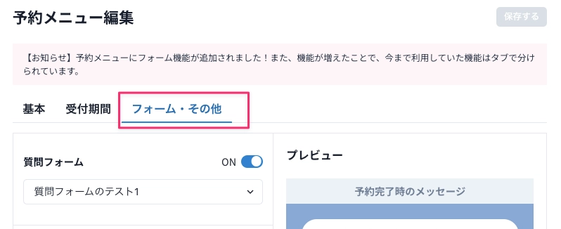 - 予約メニュー編集の画面で、「フォーム・その他」のタブをクリックして開く