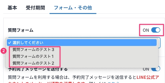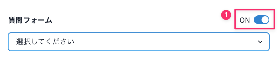 - 「質問フォーム」の横にあるボタンを「ON」にし、紐づける質問フォームを選択する