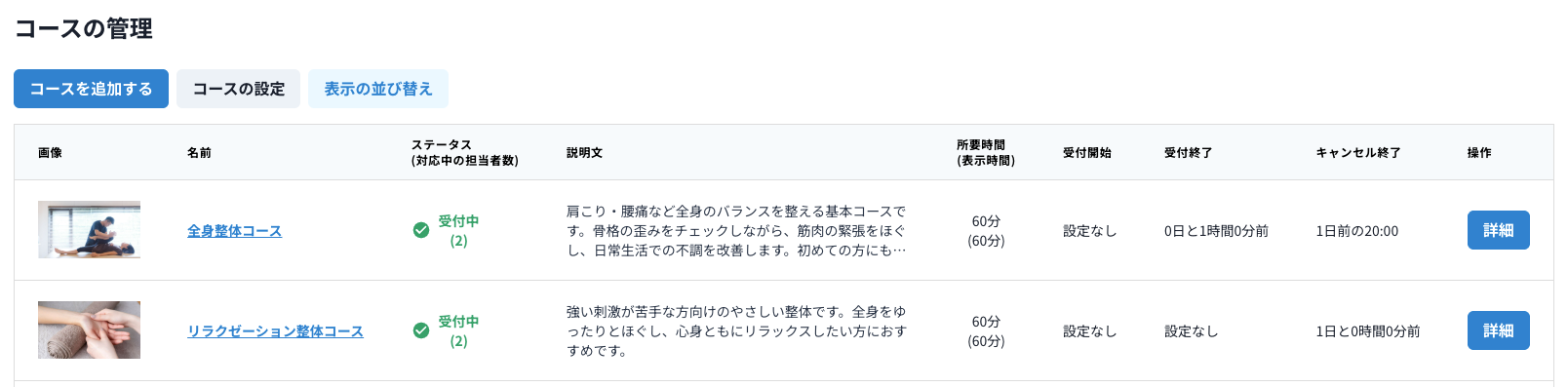 予約メニューごとに、「予約を開始する日時」「予約受付を終了する日時」「キャンセル期限」を設定することが出来ます。