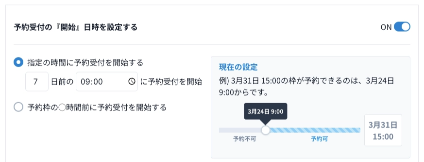 - 指定の時刻に予約受付を開始する(指定の時刻まで予約枠を表示しない)