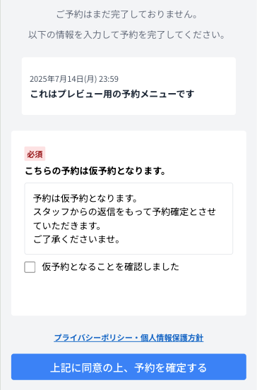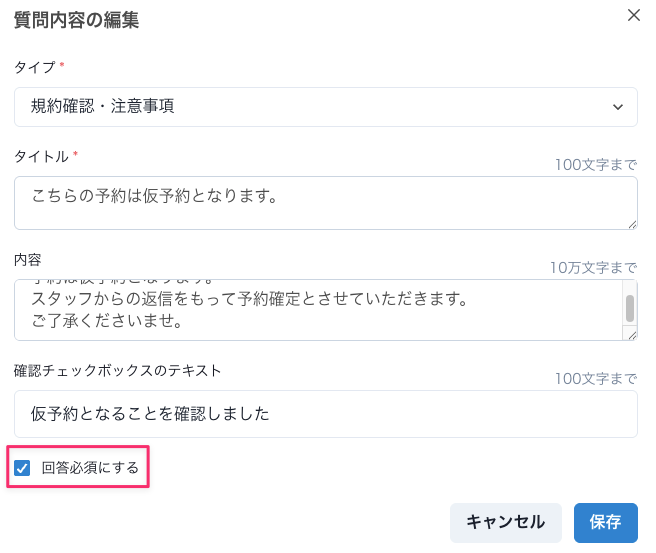 「回答を必須にする」と、確認チェックを入れないと予約ができない状態となります。